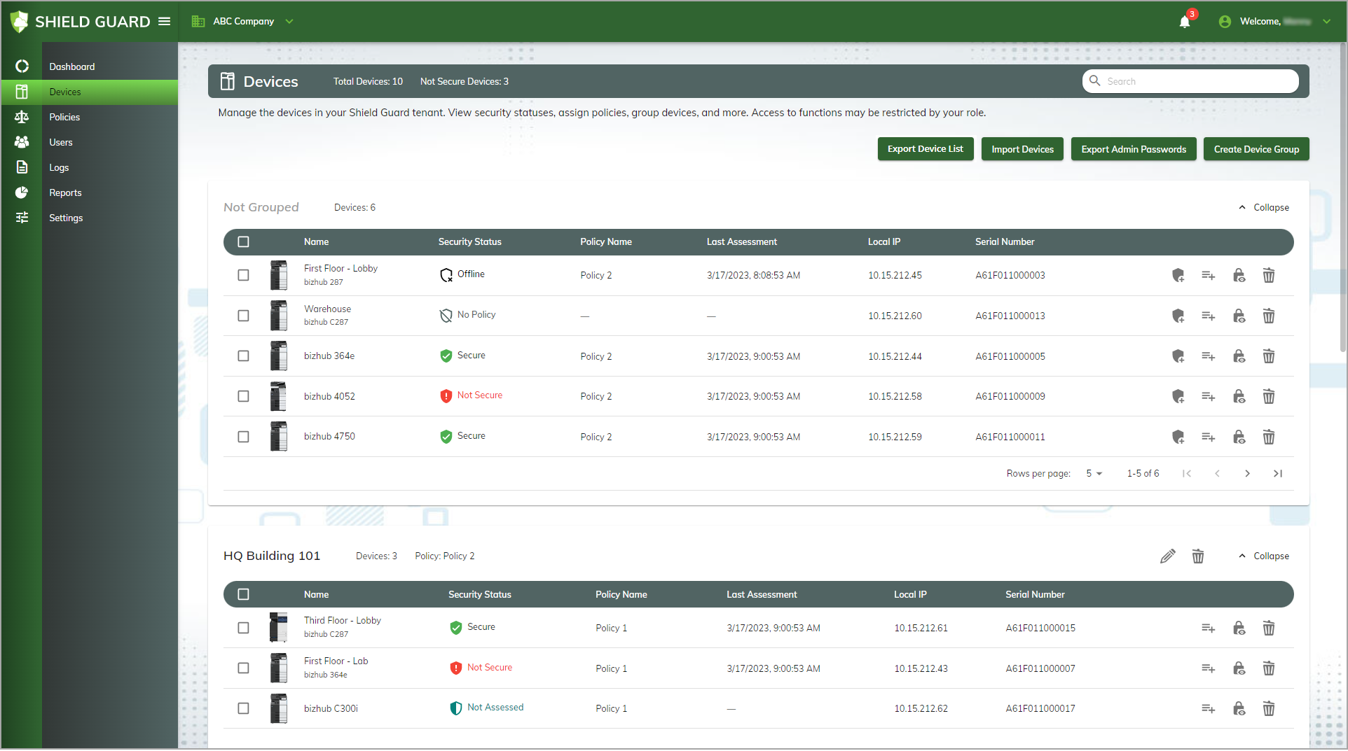 Shield Guard monitors the security settings of supported Konica Minolta MFPs (multi-function peripheral devices) and SFPs (single-function peripheral devices) on which the Shield Guard Agent is installed. Installing and launching the agent on a device makes the device available for import into a tenant via the Shield Guard Portal’s Devices page. Devices in a tenant can be assigned a security policy. Once a policy is assigned to a device, security monitoring of the device can begin.