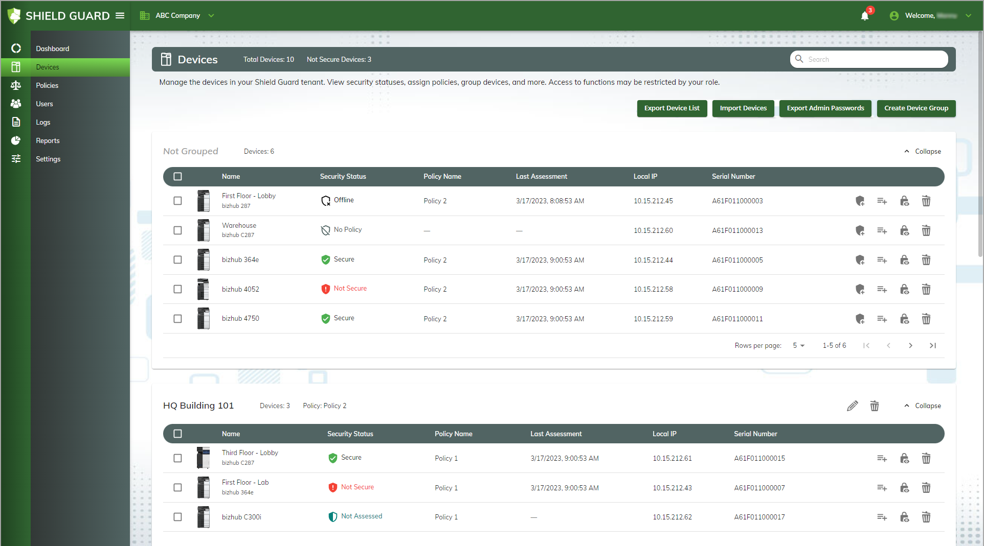 The following illustration shows the Devices page. “Devices” is selected in the Navigation pane and the Devices page displays in the Content area: