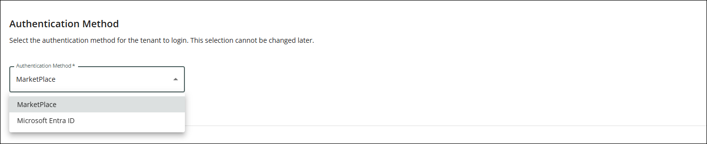 The tenant can be configured with two authentication methods: Microsoft Entra ID and Marketplace. The default authentication method is Marketplace Single Sign-On.