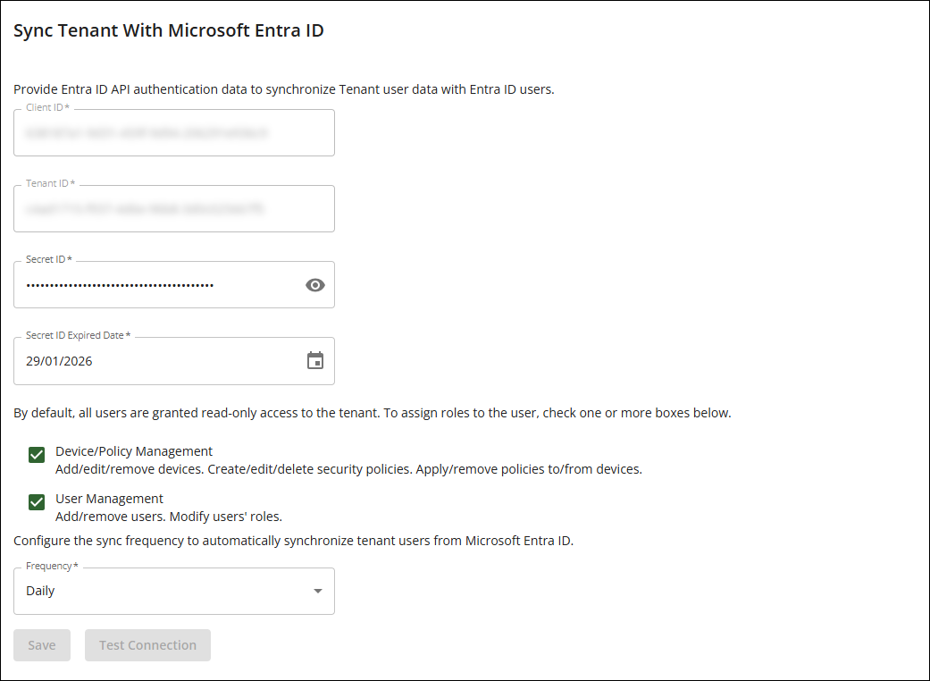 - Synchronize tenant users with Microsoft Entra ID accounts assigned to the App Registration, allowing users authenticated via Microsoft Entra ID to access and manage the tenant.